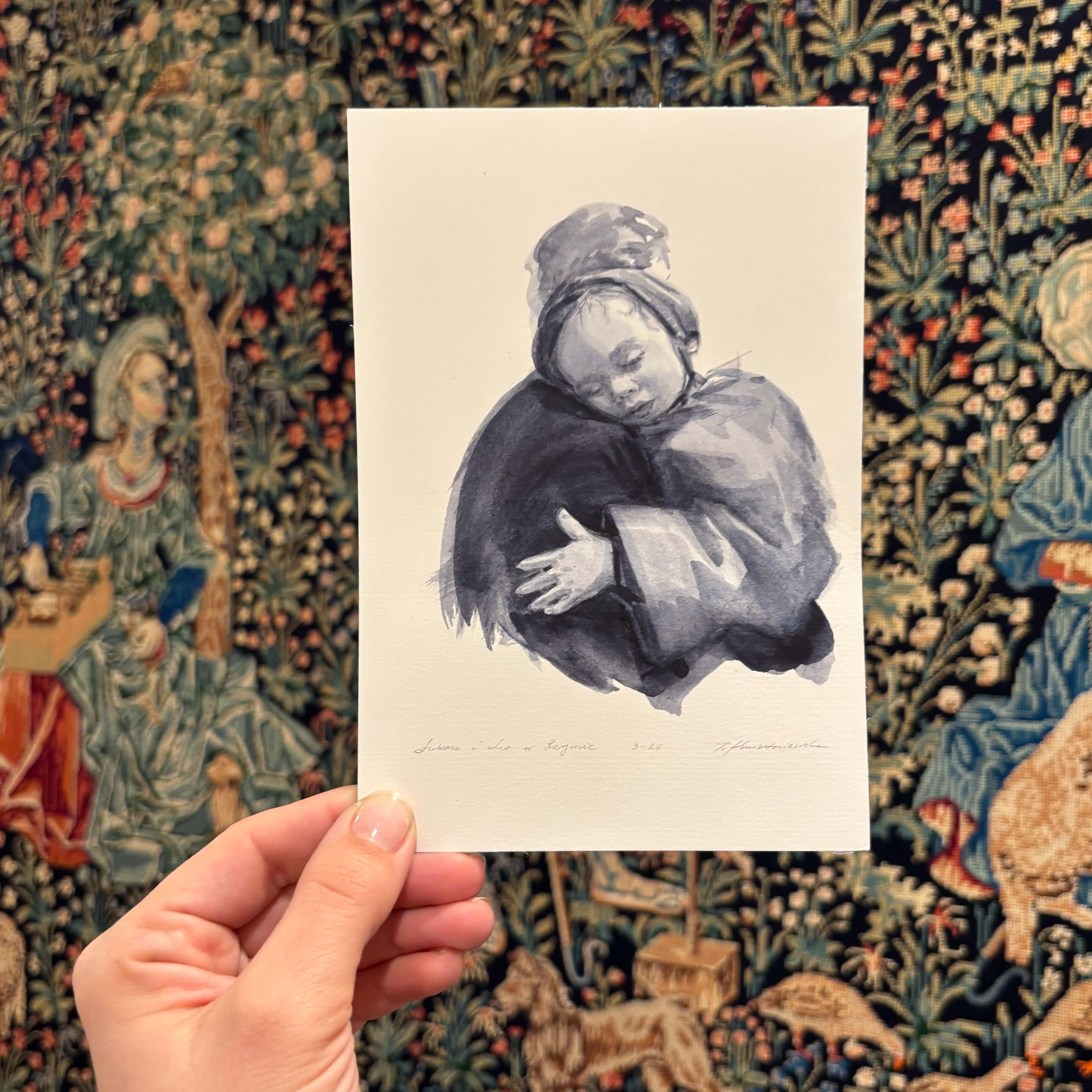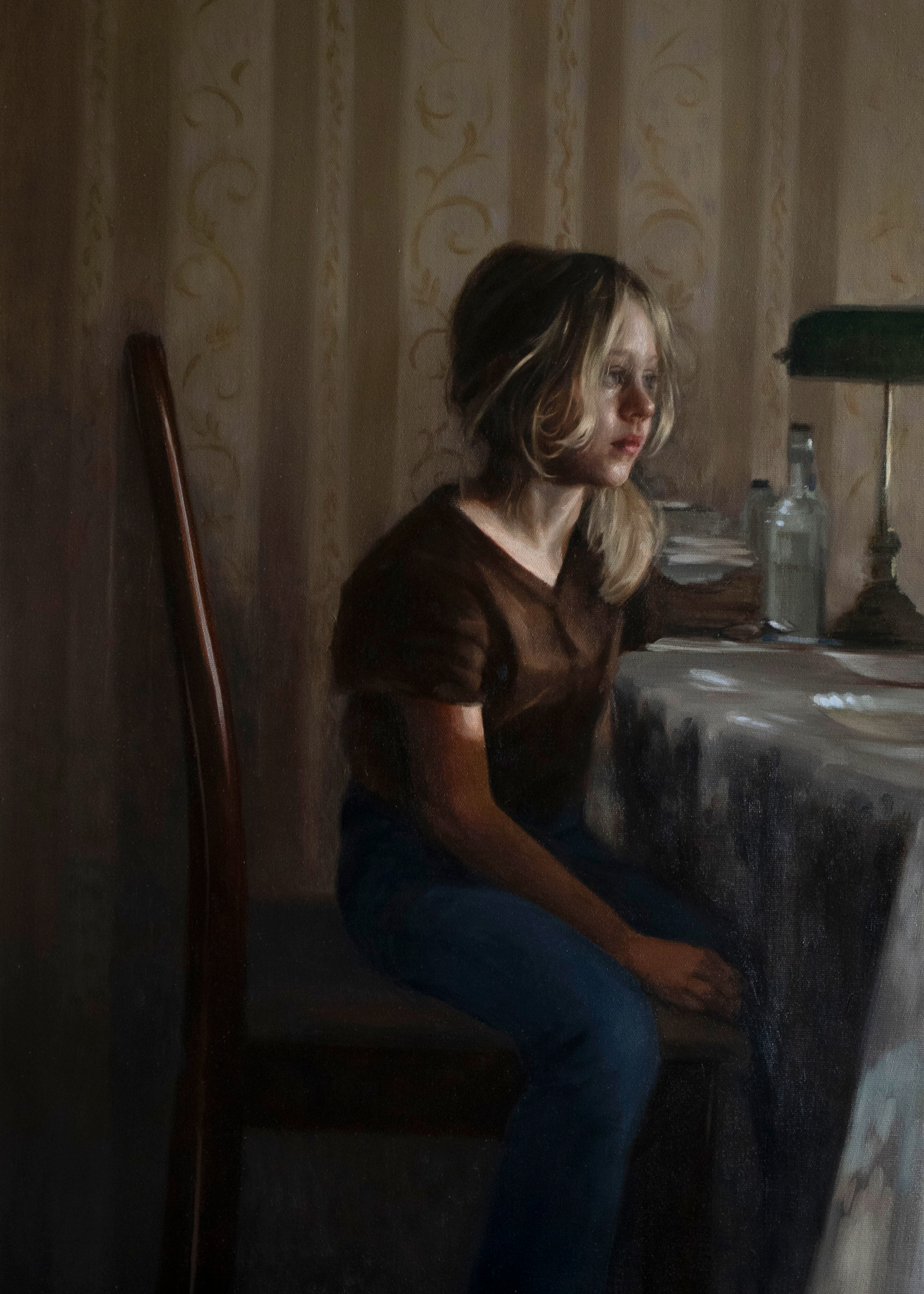 ‘Sunday Visit’ is a portrait depicting a scene in my grandparents’ home. It is the only place that has remained unchanged since my childhood, which makes being there deeply nostalgic. Watching my children in that setting feels like gazing into a mirror of the past. The bond they share with their great-grandparents is something special: they can talk and compare experiences, my grandfather recalling his earliest memories of the Second World War, while the children remind them of what it feels like to be young, both now and always. Painting this scene also made me reflect on how lonely childhood can sometimes feel, and how each of us must learn to live apart from others, for in the end there is no plural to one’s life.